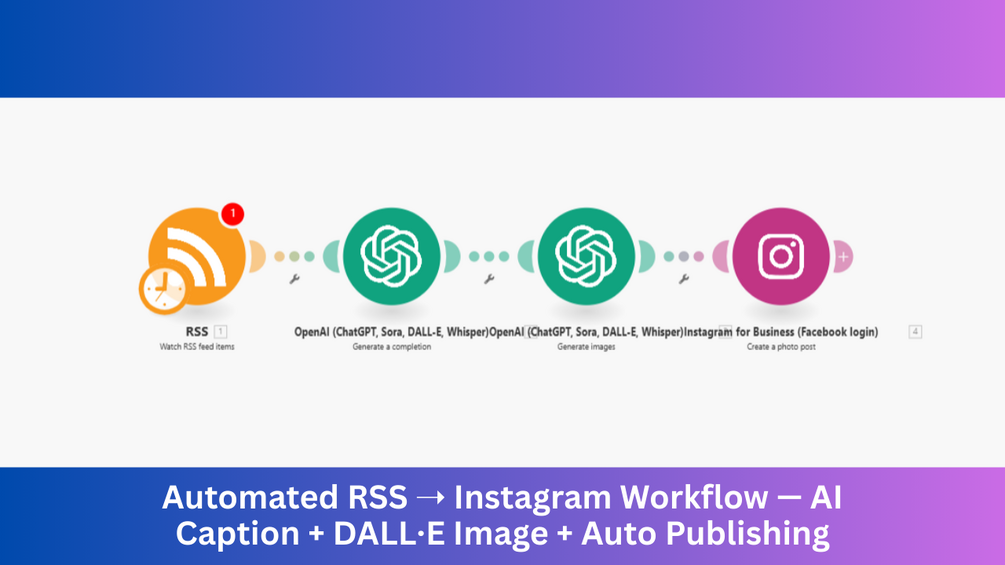 Built using RSS trigger, GPT text generation, DALL·E image generation, and Instagram API publishing modules, this workflow delivers consistent social content 24/7.